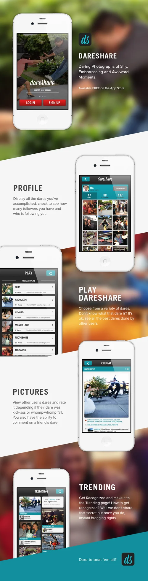 Dareshare is a mobile social gaming app that brings photos and dares together.
